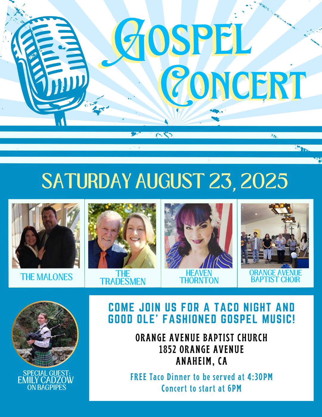 2025 PAST CONCERTS Jan. 18, 2025 (Sat) – The Malones and The Tradesmen @ Princeton Freewill Baptist Church, 810 E. Princeton St, Ontario, CA @ 6pm. NOTE: Pie Social after concert CLICK HERE FOR FLYER Feb. 1, 2025 (Sat) – The Malones and The Tradesmen @ Rock of Faith Church, 323 West “B” St, Ontario, CA @ 6pm Feb. 14, 2025 (Friday-Valentine's Day) - The Malones @ Whittier Church of God, 12302 Beverly Blvd, Whittier , CA @ 7pm. NOTE: Valentine Dinner @ 6pm before the concert. Please call Pastor John in advance for cost and reservations: 562-695- 0211 CLICK HERE FOR MORE INFO Feb. 15, 2025 (Sat) - The Malones and Rekindled Quartet, Arce Family and The Orange Avenue Baptist Church Choir @ Orange Avenue Baptist Church, 1853 W. Orange Ave, Anaheim, CA @ 6pm. NOTE: Hamburgers and Hot Dogs beore the concert. For more info, call The Malones @ 562-254-3883 March 15, 2025 (Sat) - The Malones and The Lighthouse Boys @ Calvary Baptist Church, 2990 Damien Ave, La Verne, CA @ 6pm CLICK HERE FOR FLYER March 22, 2025 (Sat) - The Malones with Rekindled Quartet @ Princeton Freewill Baptist Church, 810 E. Princeton St, Ontario, CA @ 6pm. NOTE: Pie Social after concert CLICK HERE FOR FLYER April 5, 2025 (Sat) - Jackie Malone @ PSWA Women’s Convention @ DoubleTree Hilton, 285 E. Hospitality Lane, San Bernardino, CA. NOTE: This is a fundraiser for the HEART Program/Gideons. $45 for Luncheon. Reservations Required, please contact Magda Nordahl @ 805-701-5001 or email: MagdaN@bhhscal.com CLICK HERE FOR FLYER April 19, 2025 (Sat) - The Malones and Gateway Trio @ Princeton Freewill Baptist Church, 810 E. Princeton St, Ontario, CA @ 6pm. NOTE: Pie Social after concert CLICK HERE FOR FLYER April 30, May 1, and May 2, 2025 (Wed to Fri) - Jackie Malone @ TENT REVIVAL @ High Desert Baptist Church, 10484 Johnson Rd, Phelan, CA @ 6:30pm each evening May 3, 2025 (Sat) - The Malones with The Tradesmen @ Ontario Nazarene, 1311 W. 5th St., Ontario, CA @ 6pm May 15, 2025 (Thurs) - The Malones @ Christ First Baptist, 200 N. Second Ave, Covina, CA @ 11:30am This is a senior luncheon/concert. Cost for luncheon. Please call Jackie @ 562-254-3883 for more info/cost/reservations, or call the church @ 626-339-7378 May 18, 2025 (Sun) - The Malones @ New Birth Missionary Baptist Church, 4752 Felspar St, Jurupa Valley, CA @ 3pm. NOTE: they share the building with Calvary Chapel so the name/address may show up as Calvary Chapel May 24, 2025 (Sat) - The Malones and Darren Ridings @ Princeton Freewill Baptist Church, 810 E. Princeton St, Ontario, CA @ 6pm. NOTE: Pie Social after concert CLICK HERE FOR FLYER June 11, 2025 (Wed) - Western Night featuring The Malones and Heaven Thornton @ Firehouse Church, 16800 Imperial Hwy, Yorba Linda, CA @ 7pm. CLICK HERE FOR FLYER Aug. 16, 2025 (Sat) - The Malones and Steve Allen (former bass singer with The Tradesmen Quartet) @ Princeton Freewill Baptist Church, 810 E. Princeton St, Ontario, CA @ 6pm. NOTE: Pie Social after concert. Aug. 23, 2025 (Sat) - The Malones with The Tradesmen, Heaven Thornton, and The Orange Avenue Baptist Choir @ Orange Avenue Baptist Church, 1853 Orange Avenue, Anaheim, CA. NOTE: Tacos served from from 4:30 - 6pm, Concert @ 6pm, and Pastor Paul speaking at the end of the concert. CLICK HERE FOR FLYER Aug. 31, 2025 (Sun) - The Malones @ Firehouse Church, 16800 E. Imperial Hwy, Yorba Linda , CA @ 12:30pm. Labor Day Celebration includes BBQ, Food, Fun, Music, Games and more!